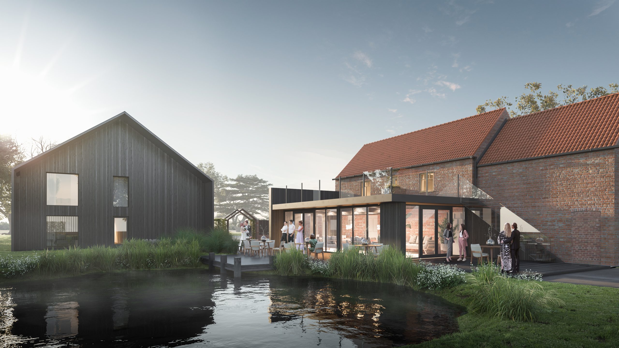 The development introduced new onsite accommodation for wedding guests, including a luxurious bridal suite, designed to provide a comfortable and elegant space for special occasions. In addition, the venue itself was enhanced with a new bar and terrace, offering stunning views over the picturesque pond and surrounding landscaped gardens. These spaces were crafted to elevate the experience of both the guests and the venue, offering a seamless integration of modern amenities with the natural beauty of the location.