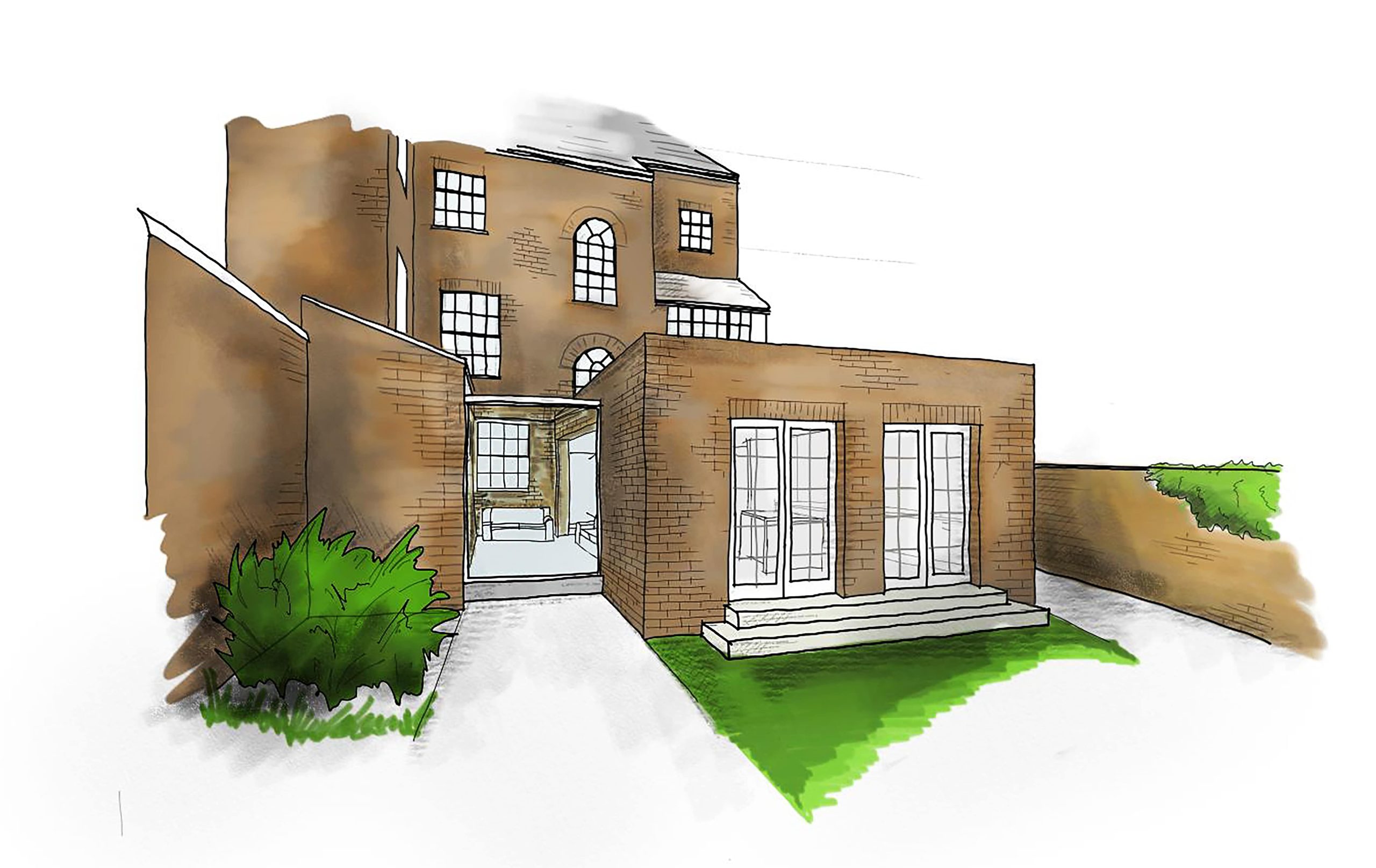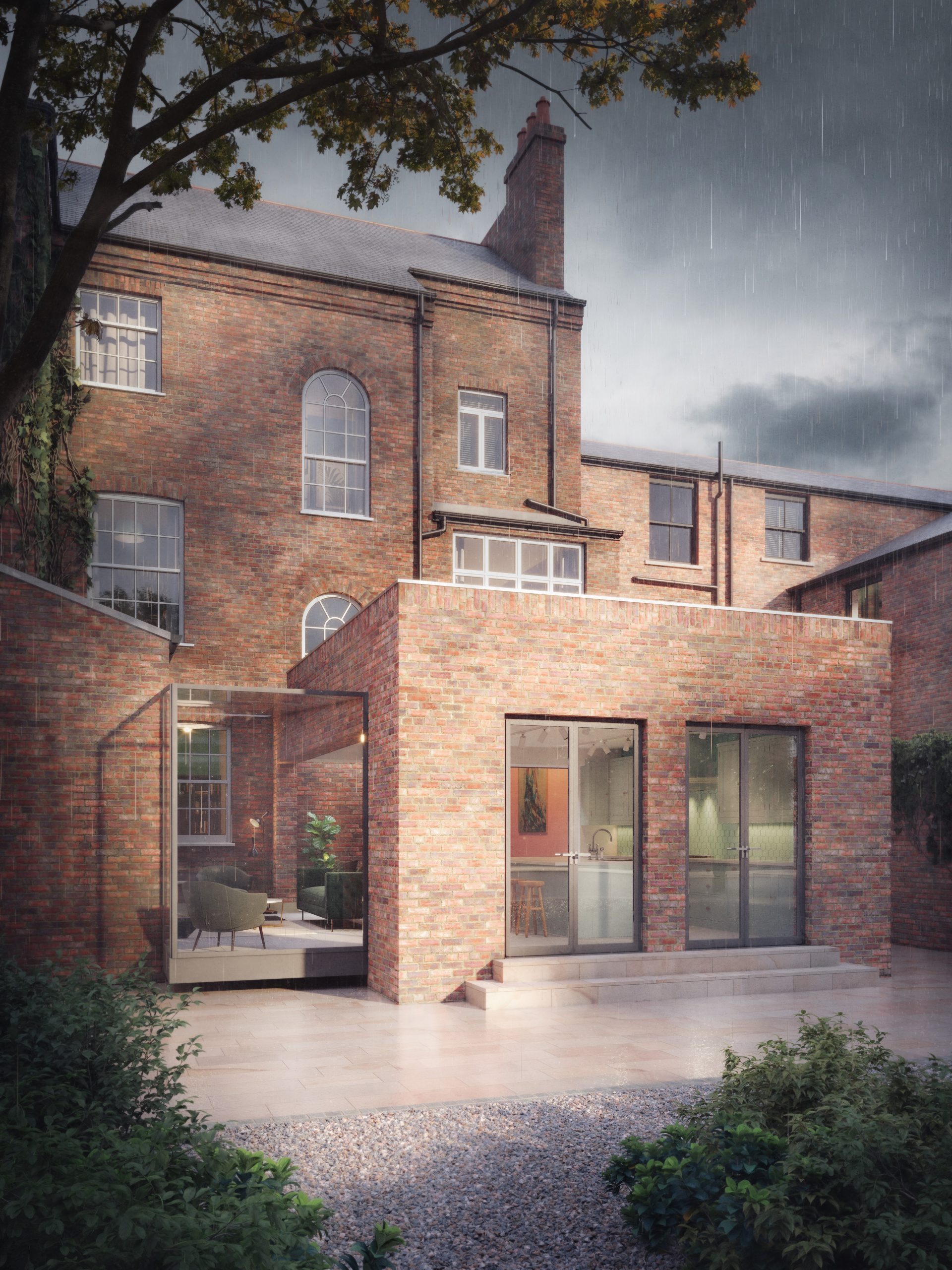 The scheme replaces a dated waiting-room addition from the building’s former life as a GP surgery. In its place, a simple and elegant brick-built volume steps forward as a contemporary counterpart to the historic structure. A light-touch, frameless glazed link creates a clear visual break, ensuring the original architecture remains celebrated while the new extension brings fresh functionality.