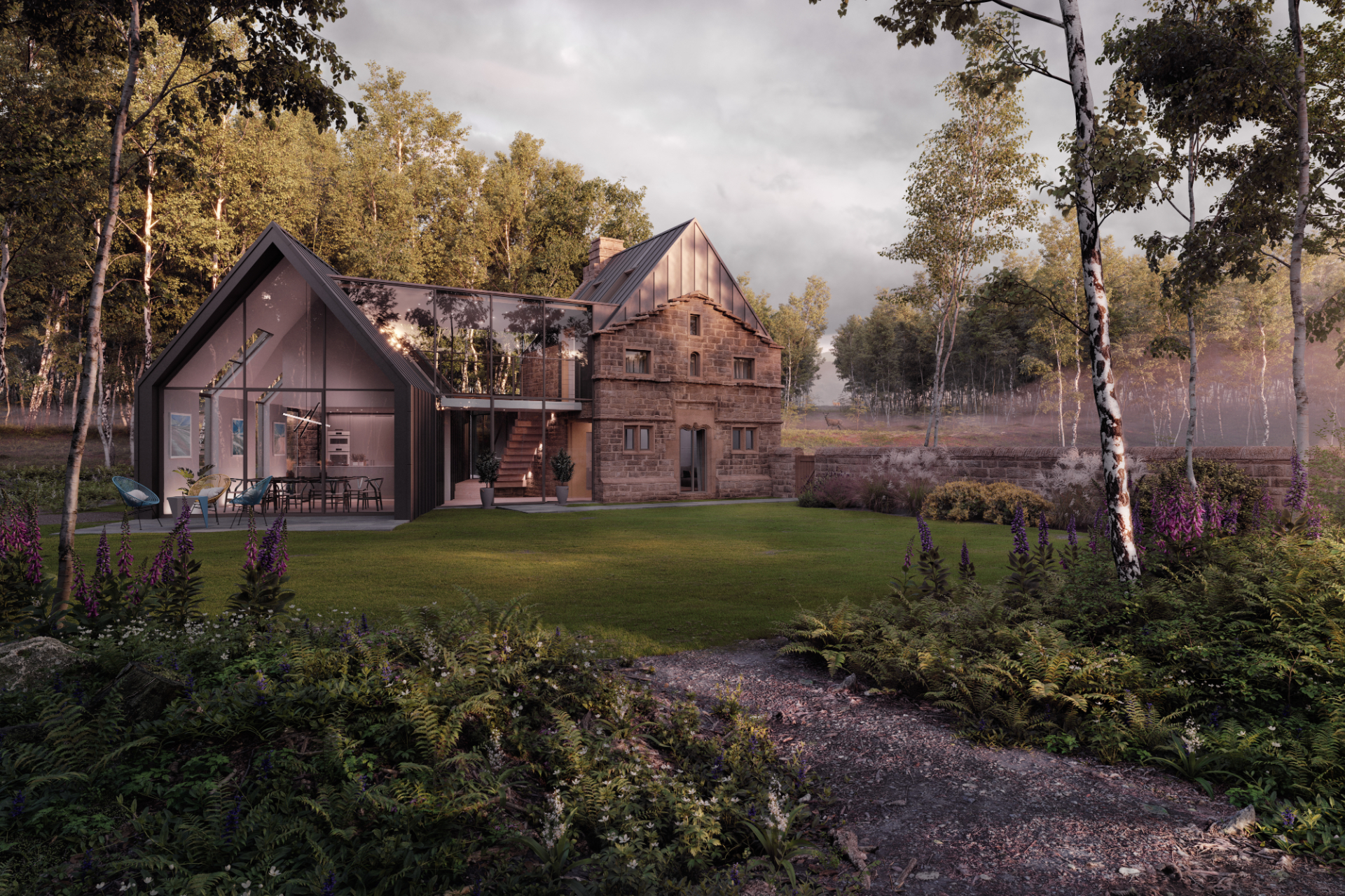The original structure is preserved in its authentic form, complemented by a bold yet respectful zincclad firstfloor extension that appears to float above the aged stonework. A delicate glazed link connects the extension to a new openplan living block, maximising natural light while maintaining a minimal visual footprint. Inside, a striking freestanding staircase sits near the original stone walls without touching them—an elegant expression of the project’s “lighttouch” philosophy.