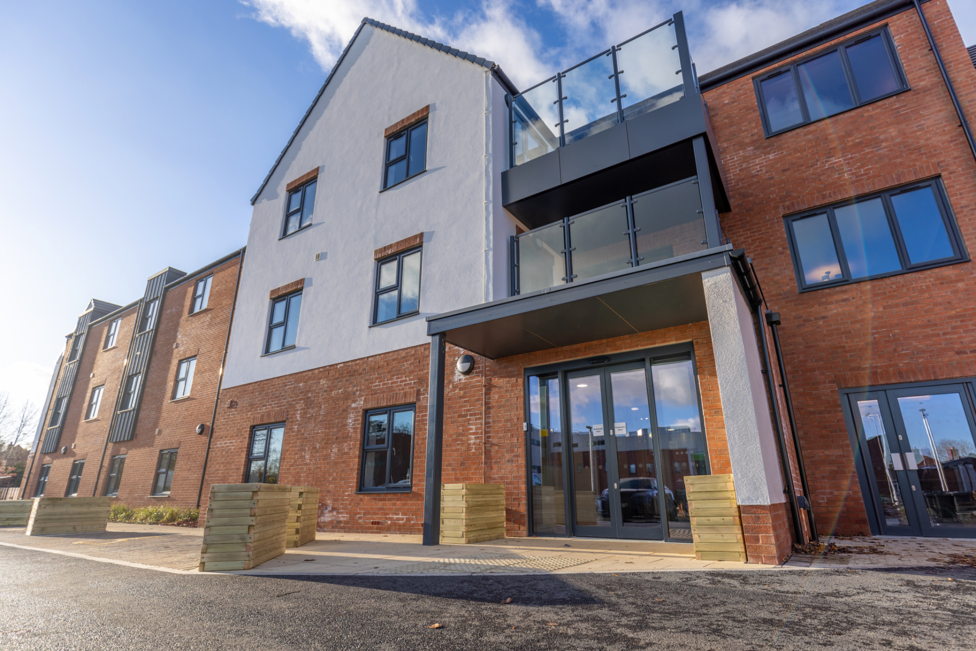 Stepped back sensitively from Leicester Road, aligned with St. Lukes Hospital, creates a visually cohesive streetscape. A threestorey frontage transitions to lower roof levels toward the rear, ensuring a respectful relationship with nearby homes. Its façade combines three complementary materials, giving the development a strong, engaging identity.